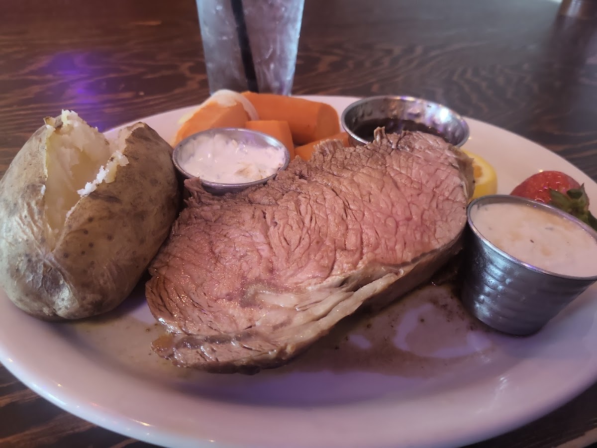 Great local steakhouse. At first I thought the prices seemed high but when I realized the portion size I knew the value was great. We split the prime ribeye and it easily fed two people. The cost was about $32 for a steak dinner which is a great value. Will be back if I come through the area